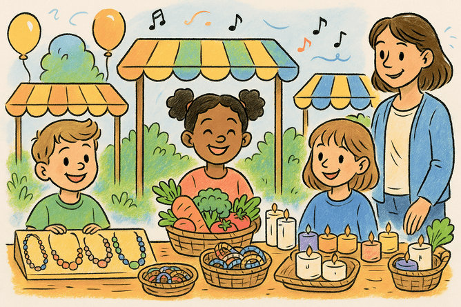 A kids market transforms learning into something hands-on and memorable. Children apply maths by counting money and tracking sales, practice literacy by designing signs or product descriptions, and develop communication skills by talking to customers.
